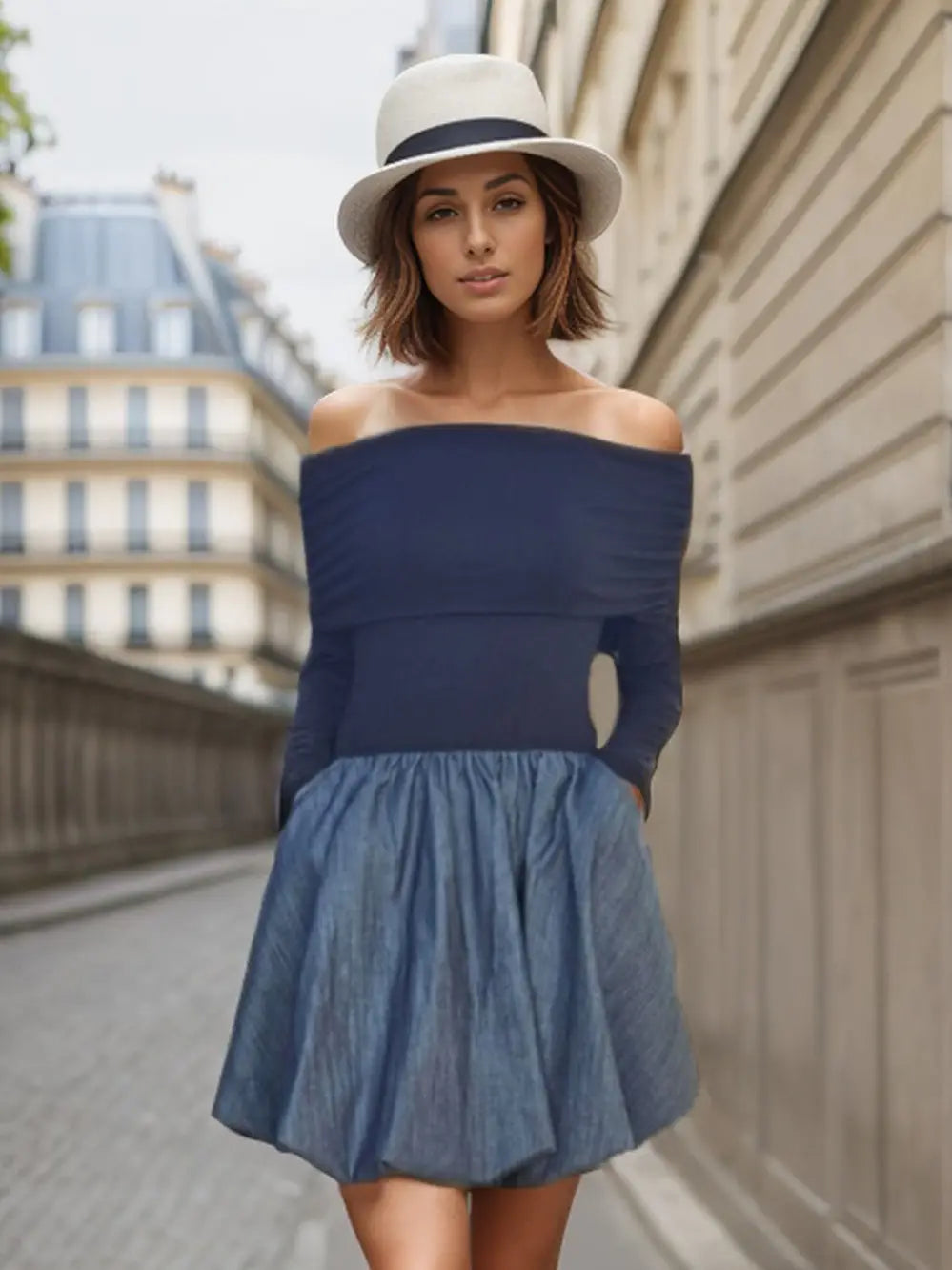* OFF SHOULDER BUBBLE DRESS * SIDE POCKET * WAIST ELASTIC BAND * 95% VISCOSE 5% SPANDEX * SKIRT: 100% COTTON
