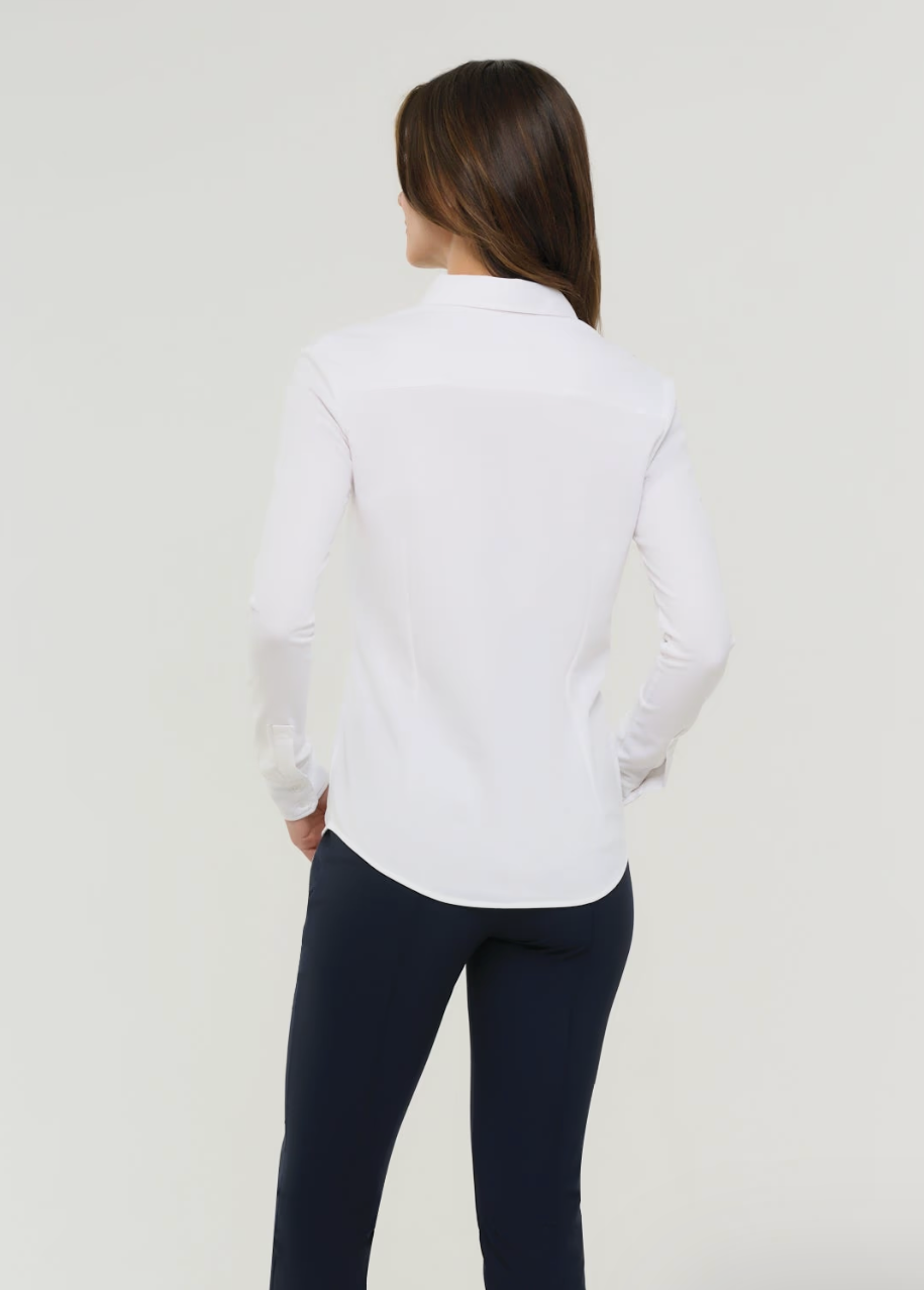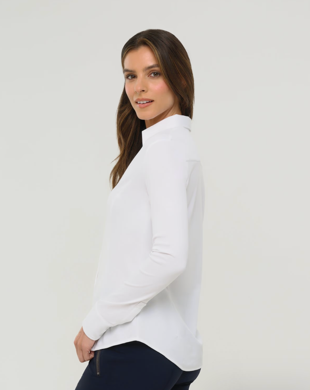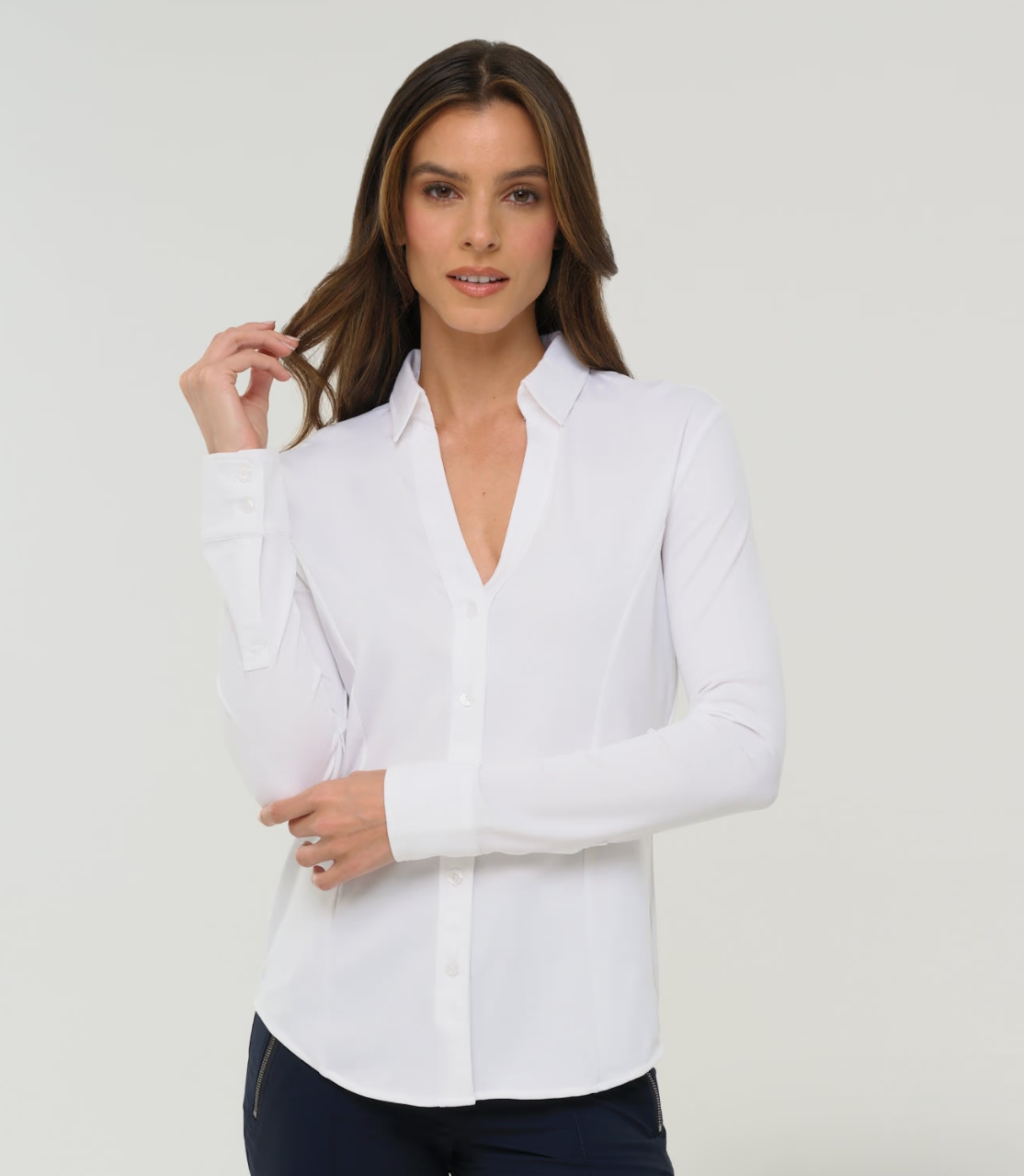 Stretch comfort is our claim to fame, and this women's top embodies this and so much more. We've created the perfect button-front shirt, one you can simply throw on and to look comfy with your favorite yoga pants or roll up to pack in your tote bag and never worry about ironing. Crafted in our comfortable mid-weight stretch pique fabric, this feminine style features full-length long sleeves and a sexy V-neck. Impeccable tailoring—a pointed collar, two-button cuffs, and rounded hem—make it a modern wardrobe essential for #everydayanatomie.