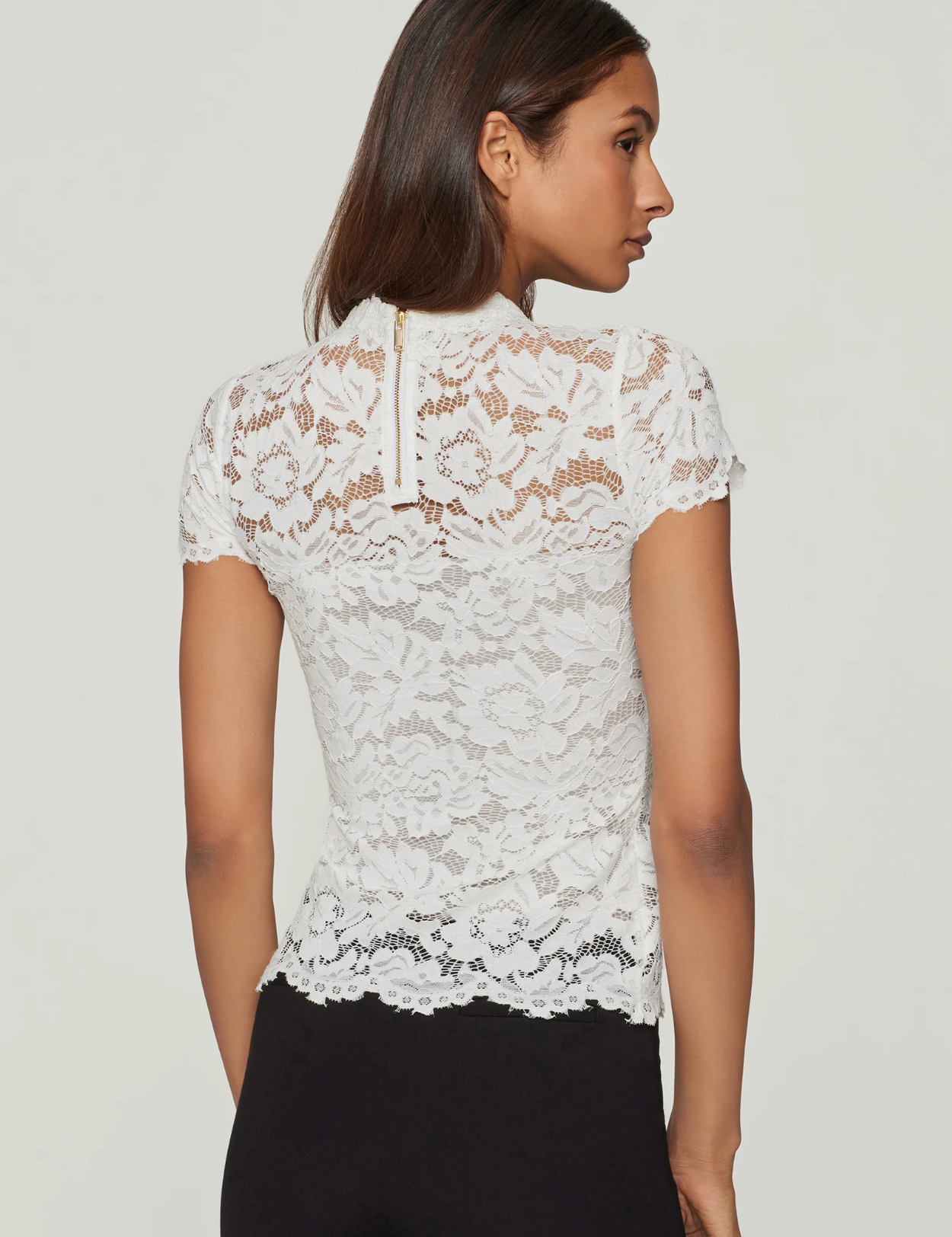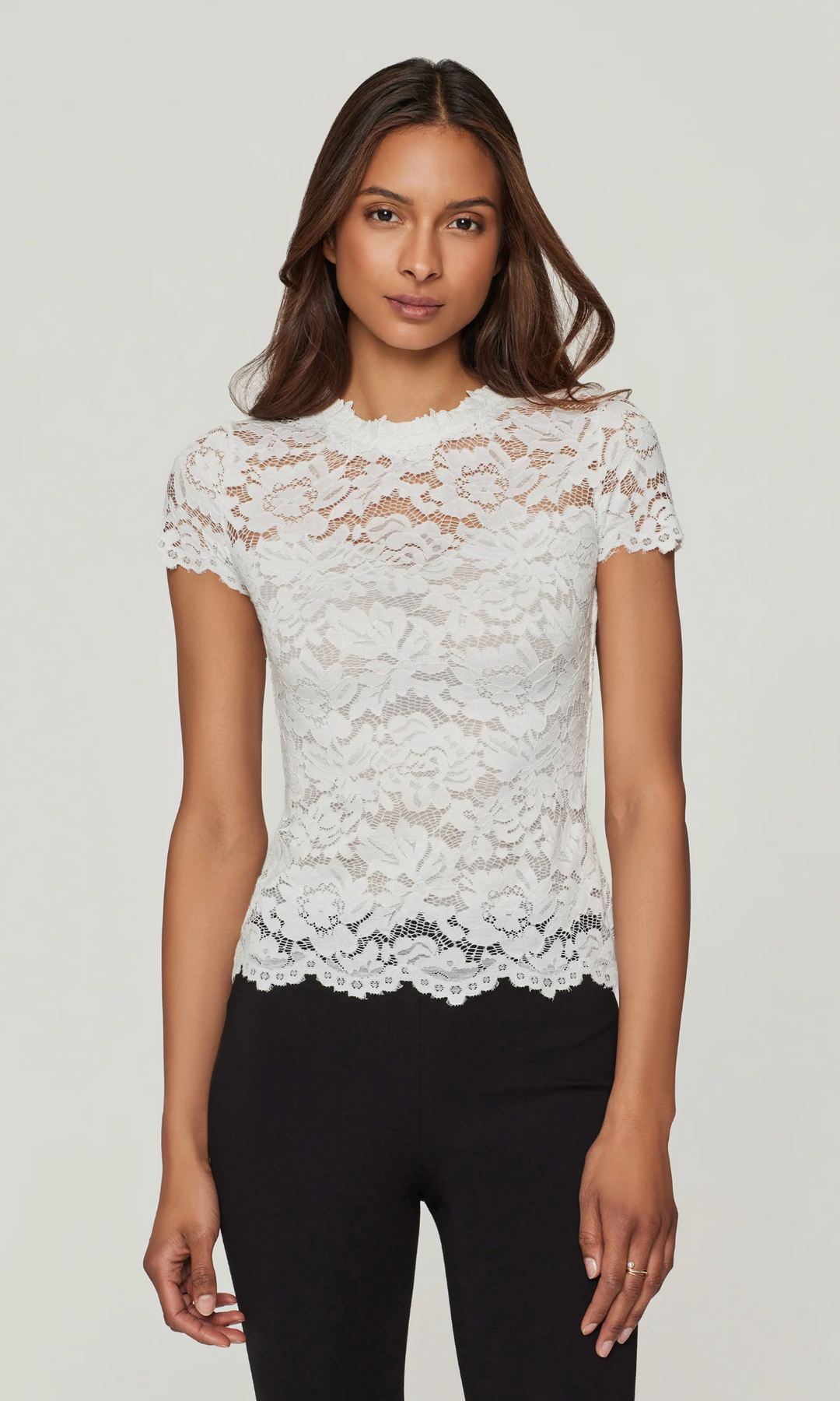 The Giada Lace Top in white offers delicate lacework with a refined silhouette grounded in rich color. Its fitted body, scalloped edges, and mock neck add modern romance, while the crisp white hue enhances the intricate lacework, offering a fresh, refined look.